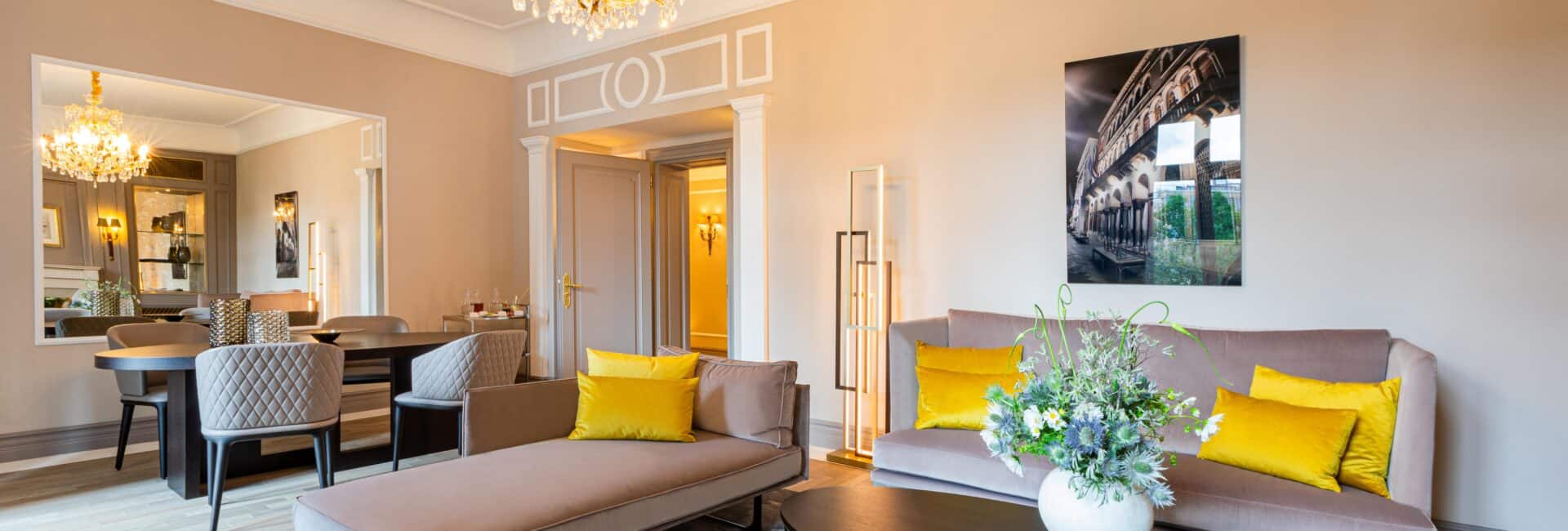 Luxuriöse Suite mit getrenntem Wohn- und Schlafbereich, zeitlos elegant gestaltet. Hochwertige Materialien, ein Natursteinbad und eine gemütliche Sitzecke sorgen für ein exklusives Wohlfühlambiente während des Aufenthalts.